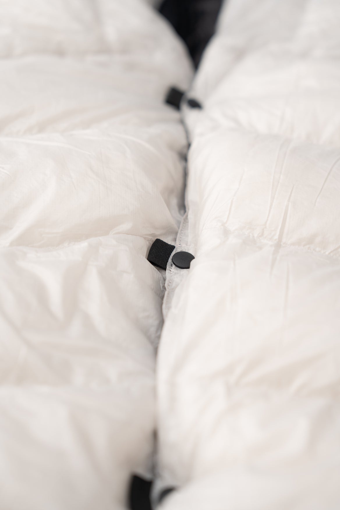 We can currently source the duck down in a fill power of 850, which means we will use more of it in a quilt compared to a 950 fill power down in order to achieve the same temperature rating. Therefore, a quilt with the 850 FP duck down will be slightly heavier than a quilt filled with 950 FP goose down.