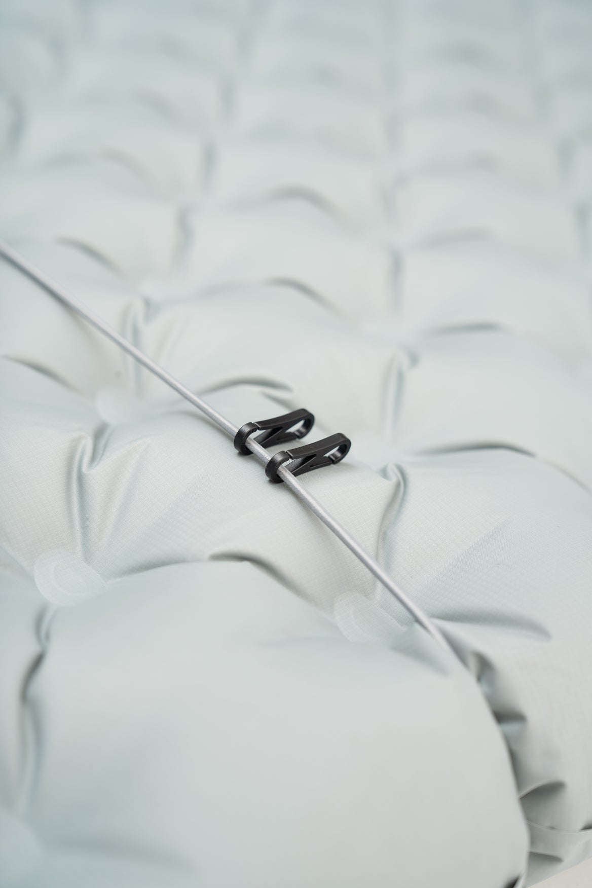 1. Put the 2 pad straps over your sleeping pad, one around where your hip will be and one where your shoulders will be. Ensure the 2 male clips on the strap are facing up.